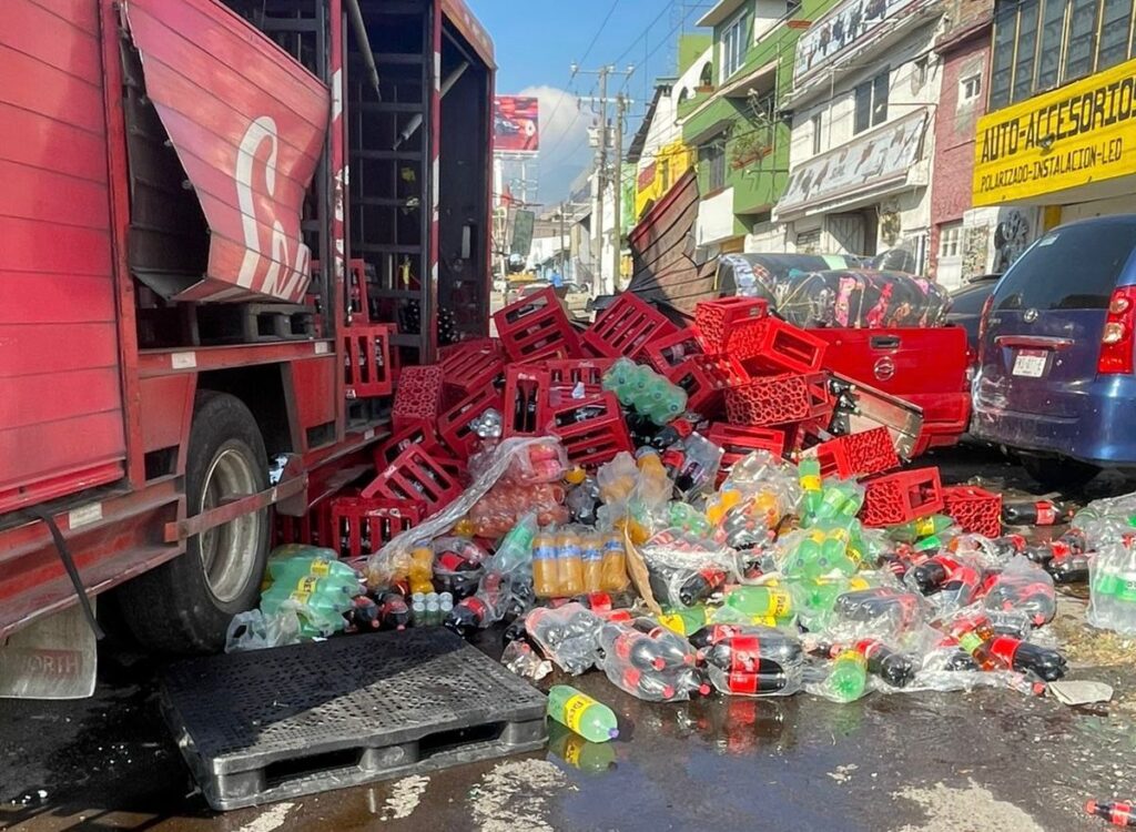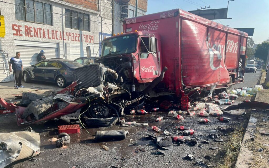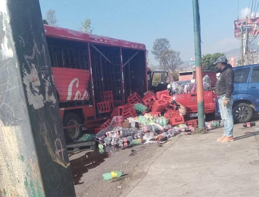 Morelia.— La mañana de este miércoles 24 de diciembre, un camión de reparto de Coca-Cola protagonizó un accidente sobre el Periférico Paseo de la República, a la altura de la colonia El Lago, generando tráfico lento en la zona y pedidas materiales por varios miles de pesos.