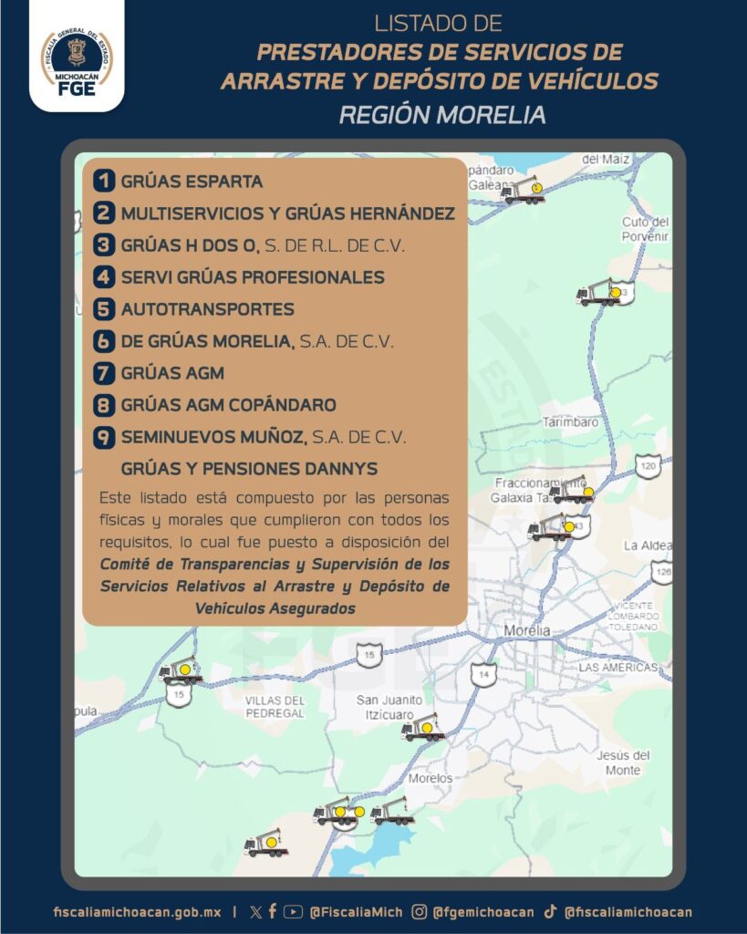 Morelia, Michoacán, a 27 de abril de 2026.- Como parte de las acciones para fortalecer la transparencia institucional y dar mayor certeza a la ciudadanía, la Fiscalía General del Estado de Michoacán (FGE) dio a conocer el padrón oficial de prestadores de servicios de arrastre y depósito de vehículos correspondiente a la Región Morelia, integrado por empresas y personas físicas que acreditaron el cumplimiento de los requisitos establecidos en convocatoria pública.