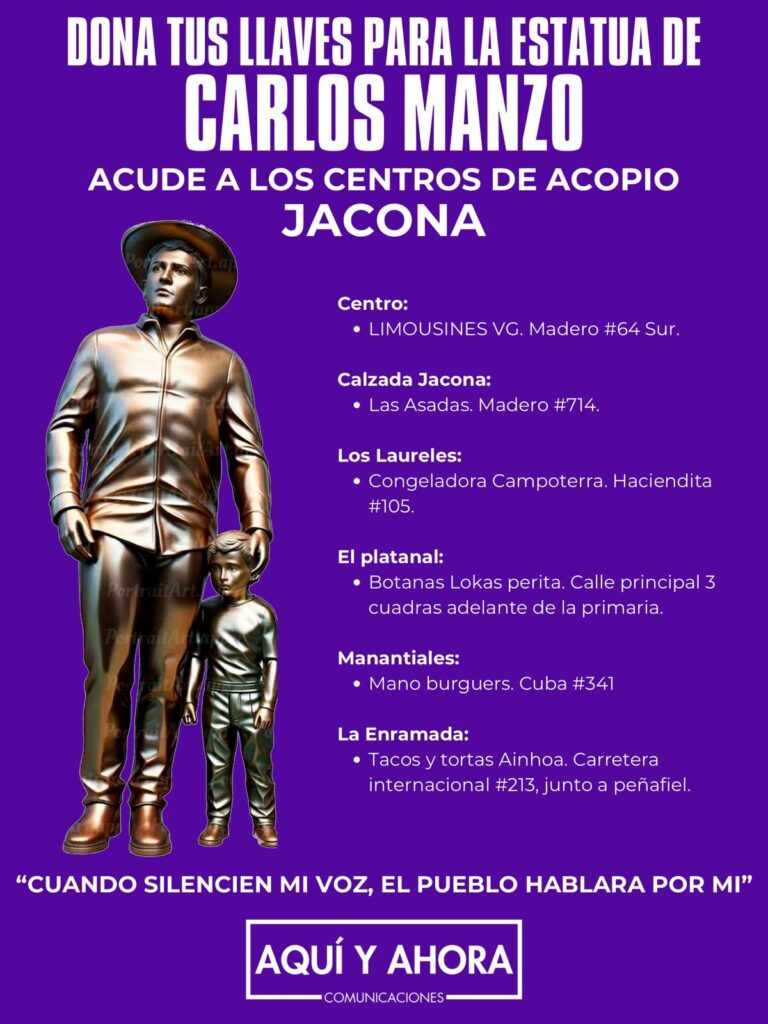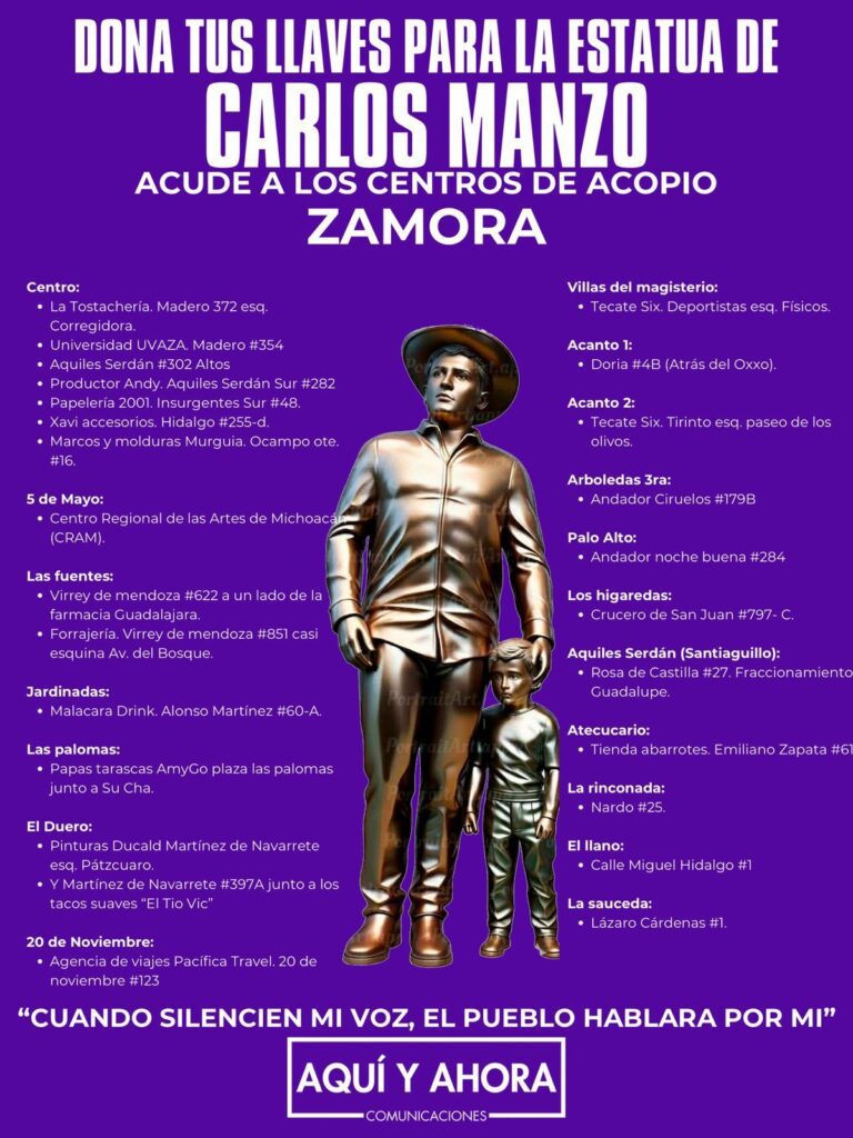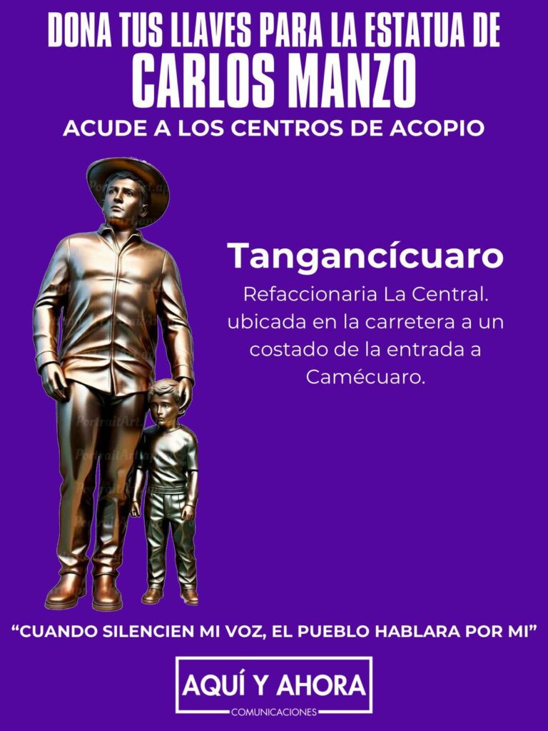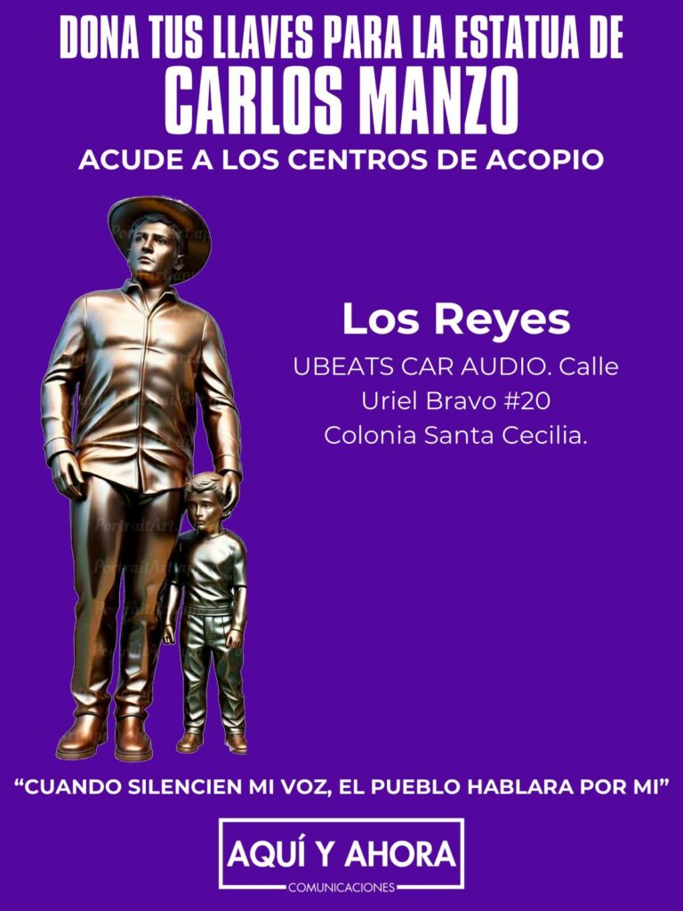 Con el propósito de rendir homenaje al legado de Carlos Manzo, figura emblemática por su compromiso social y su entrega a la comunidad, se ha puesto en marcha una campaña de recolección de llaves y metales que serán fundidos para dar vida a su estatua conmemorativa, bajo el nombre de NI UN PASO ATRÁS, este proyecto fue iniciado por el gobierno de Uruapan que preside Grecia Quiroz.