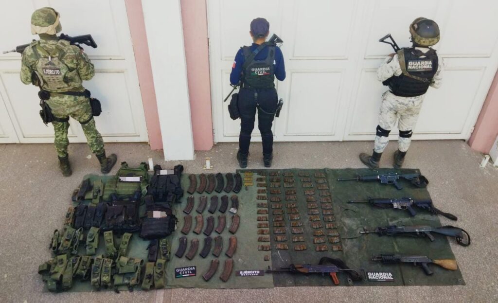 De inmediato, emprendieron las acciones correspondientes para su detención y después de repeler la agresión, los efectivos de SP lograron asegurar a un hombre como presunto implicado; asimismo, se localizaron dos armas de fuego AR-15 y tres más tipo AK-47, junto a 636 cartuchos útiles, 23 cargadores, ocho placas balísticas, cuatro chalecos tácticos y cinco fajillas con cartucheras.