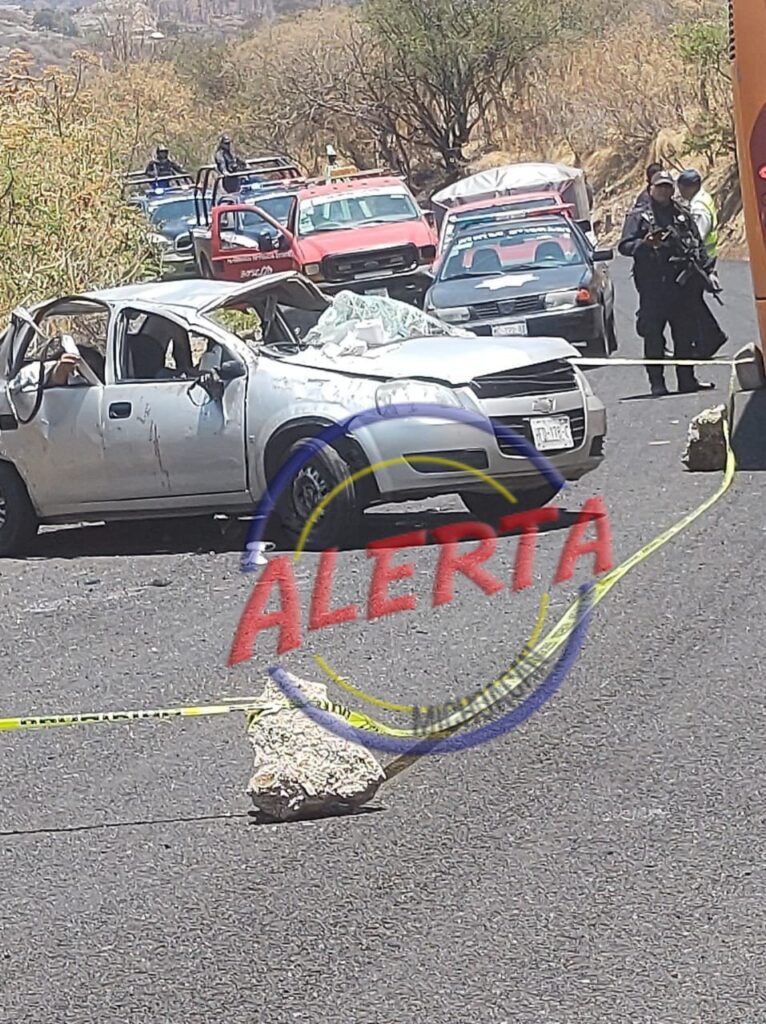 TACAMBARO MICH., 18 de mayo.- Dos personas murieron y cuatro más resultaron lesionadas, entre estas tres menores de edad, al volcar el auto en que viajaban procedentes de la ciudad de Huetamo.